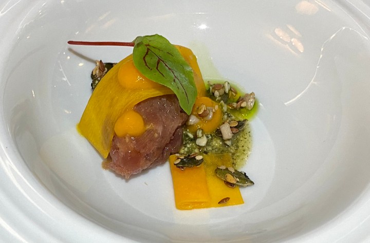 The first course was tuna tartar with pumpkin textures and pumpkin seed pesto. The combination of tuna tartar with pumpkin seeds was very nice, both in flavor and in texture. The pairing worked very well. 8/10