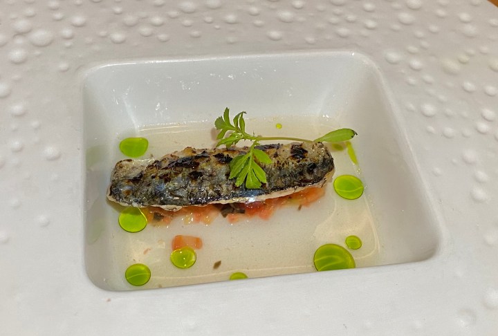 The second course was a grilled sardine with tomato concassé and tomato dashi. A very nice combination and a very good wine pairing. 9/10