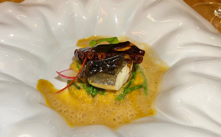 The fish main course was cod with octopus, samphire, and a bisque enriched with saffron. The cod and octopus were perfectly cooked and the bisque was very flavorful without being overpowering. The sommelier suggested we stayed with the rosé and he was right, as it was a great pairing. 9/10