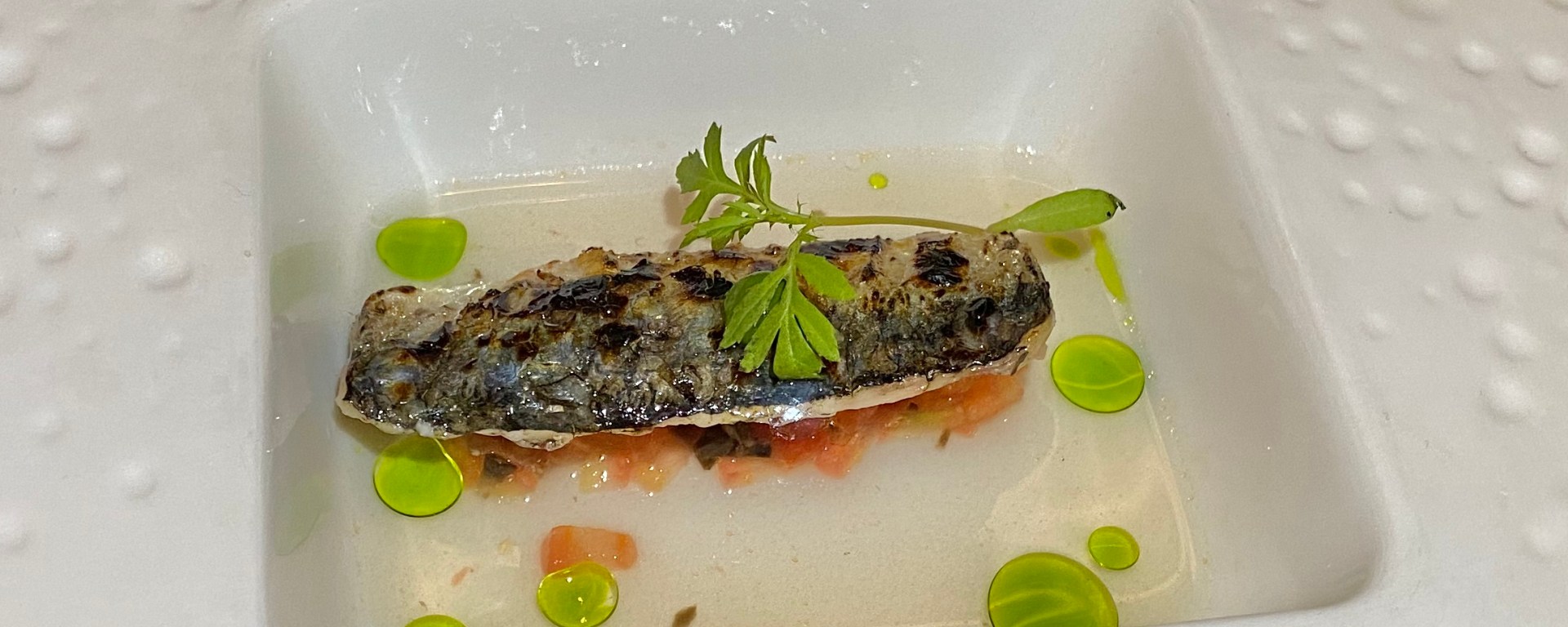 The second course was a grilled sardine with tomato concassé and tomato dashi. A very nice combination and a very good wine pairing. 9/10