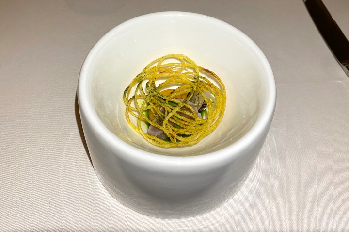 The first course was oyster with raw shrimp, caviar, and plankton. It was an excellent pairing with the wine, especially with the oyster.