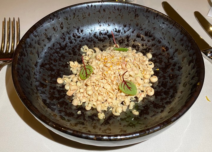 It was paired with this vegan dish: celeriac ‘ravioli’ stuffed with parsnip puree, and served with mushroom broth and a toasted almond. The thinly sliced celeriac served as the ‘pasta’ of the ravioli. The mushroom broth had great flavor, but didn’t stick to the ravioli and so it was difficult to taste them together. The wine pairing was OK; a more earthy wine or even a light red would have been better.