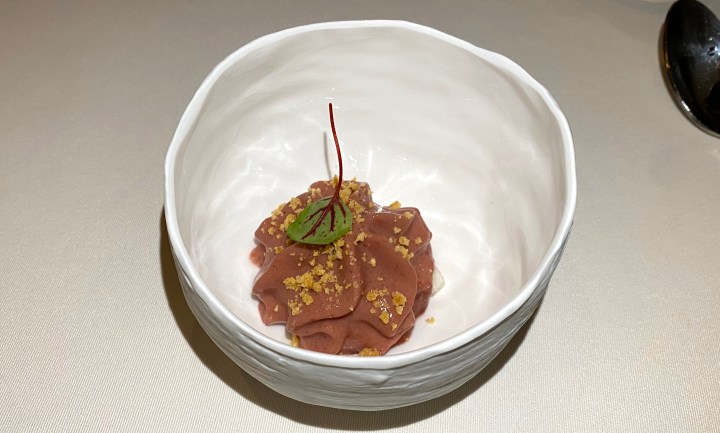It was a good pairing with raw Lirio, a fish from the nearby coast, served with tomato, bell pepper, and gazpacho. The fish was impeccably fresh.