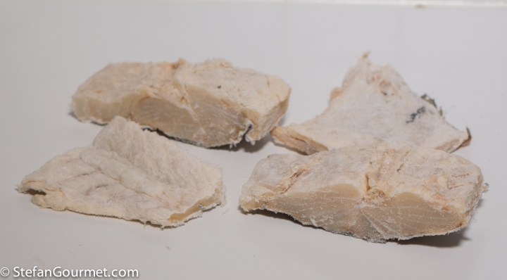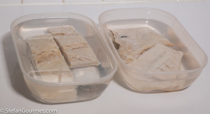 Soak the bacalhau in cold water, keeping it refrigerated, and refreshing the water three times per day. The bacalhau I took home was “especial” and so it took 72 hours or 9 times of changing the water.