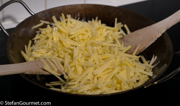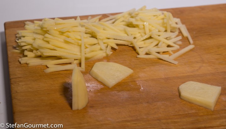 Fry the potato sticks in a generous amount of olive oil over medium heat…