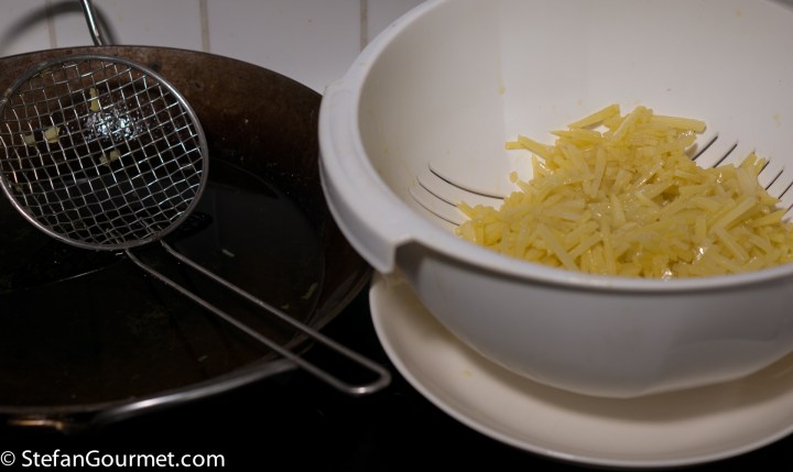 Soak the potato sticks in cold water to remove the excess starch, then dry them with a clean tea towel.