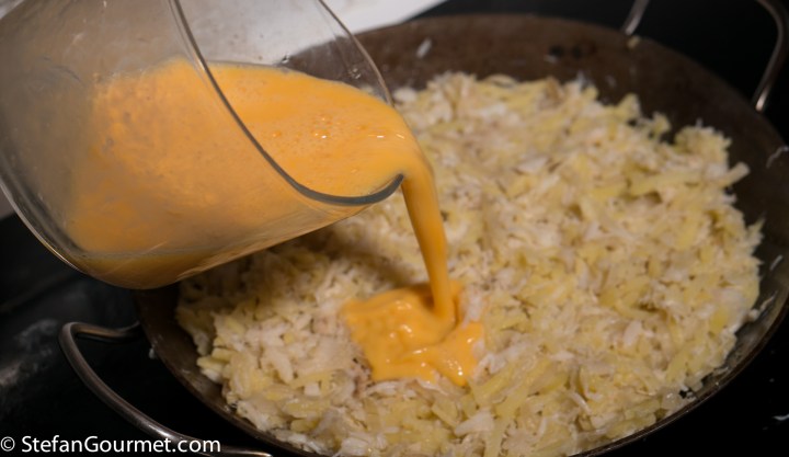 This is just like making carbonara: the eggs should be cooked by the heat of the potatoes, onion, and bacalhau. The egg should not stay too runny, but you don’t want scrambled eggs or a frittata either.