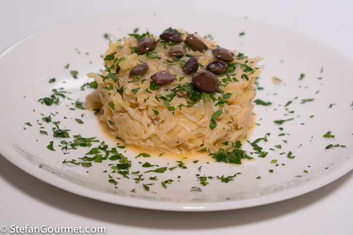 Bacalhau, salted cod, is an ingredient that is used a lot in Portuguese cooking. It is so popular in Portugal that the supermarket had a special department with just bacalhau. Bacalhau is not produced in Portugal itself, but imported from places like Norway and Iceland. It was ‘invented’ in the time that we did not yet have refrigerators to store fish. Good quality bacalhau is delicious (bad quality smells too fishy) and can be eaten without cooking after it has been soaked in cold water. In this way you can compare it to the fish-version of prosciutto (salted leg of pork).