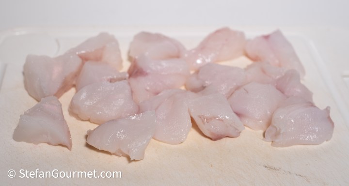 Cut the fish into bite size pieces. Season them with salt on both sides, and allow to sit while you prepare the pumpkin.