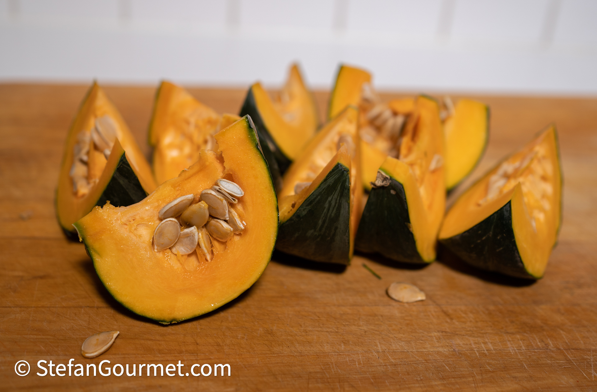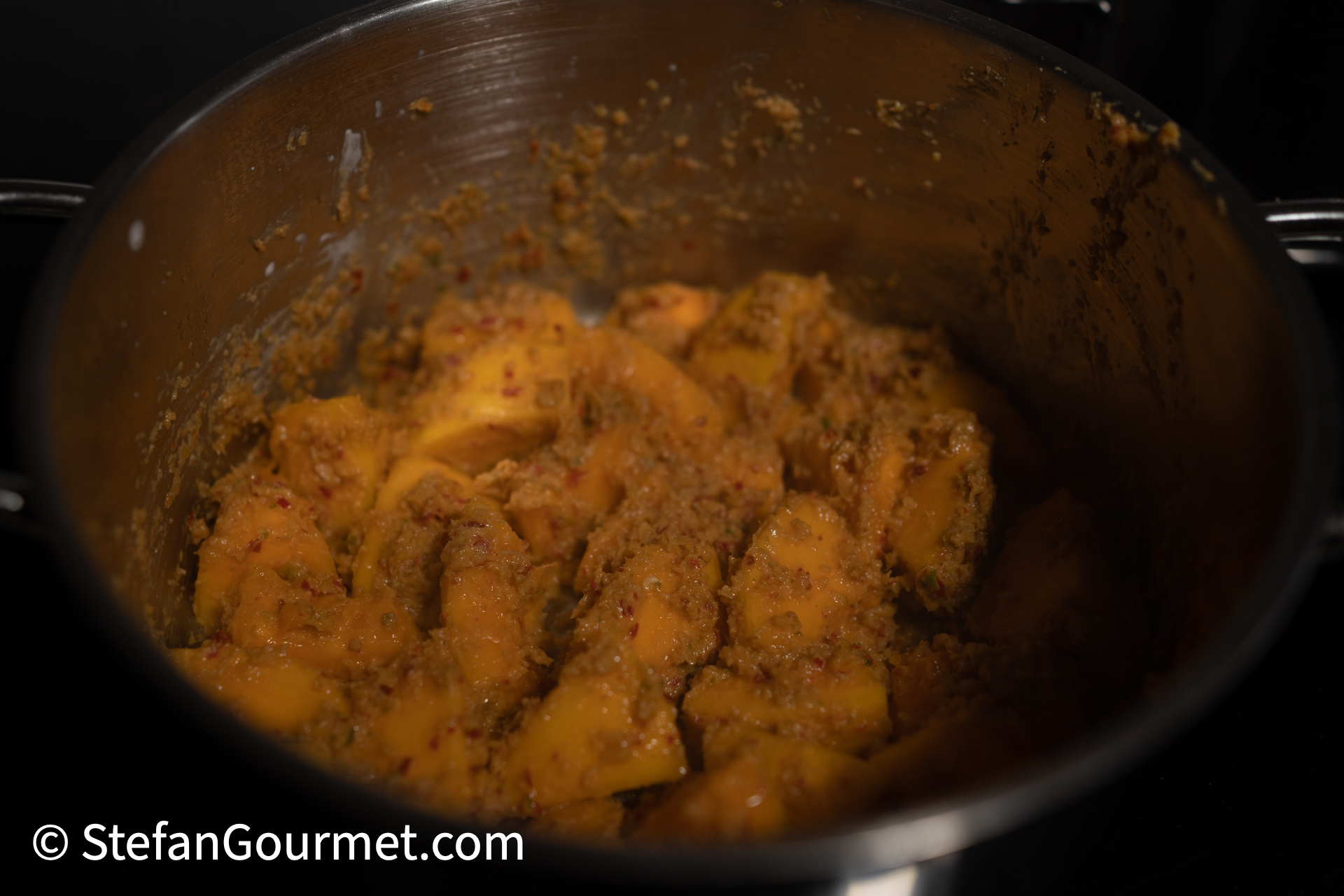Cut the fish into bite size pieces. Season them with salt on both sides, and allow to sit while you prepare the pumpkin.