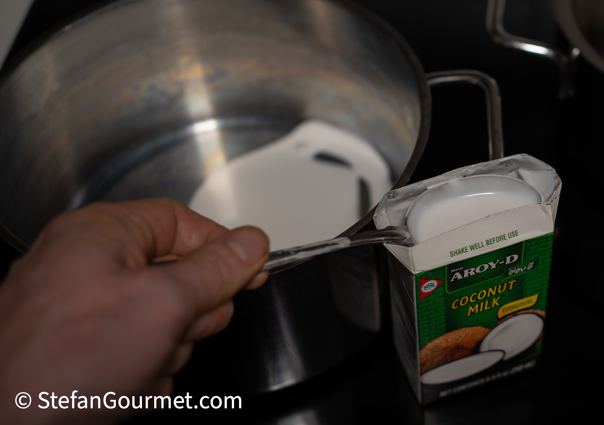 Do not shake the coconut milk, so the coconut cream will still float on top. Skim it off with a spoon into a saucepan.