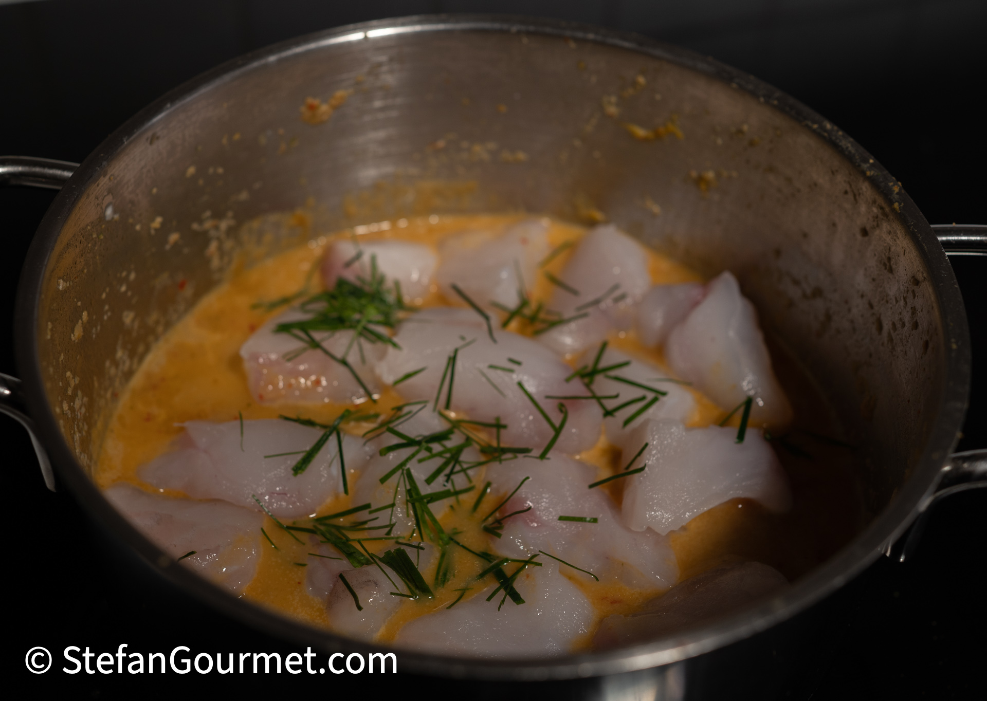 Stir until the fish is covered with the curry sauce, then cover the pan, and allow to rest for 5 minutes.
