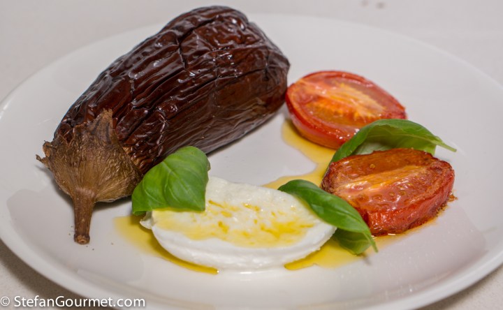 Smoked eggplant with buffalo mozzarella and tomato confit is a classic combination that is taken to the next level by smoking the eggplant and slow-roasting the tomato.