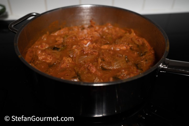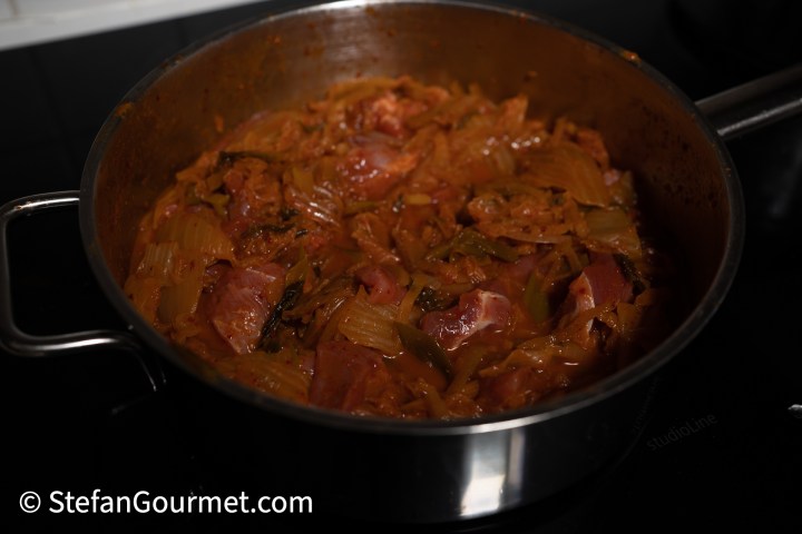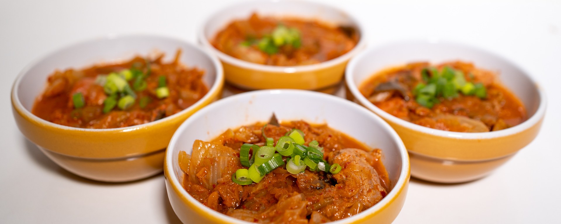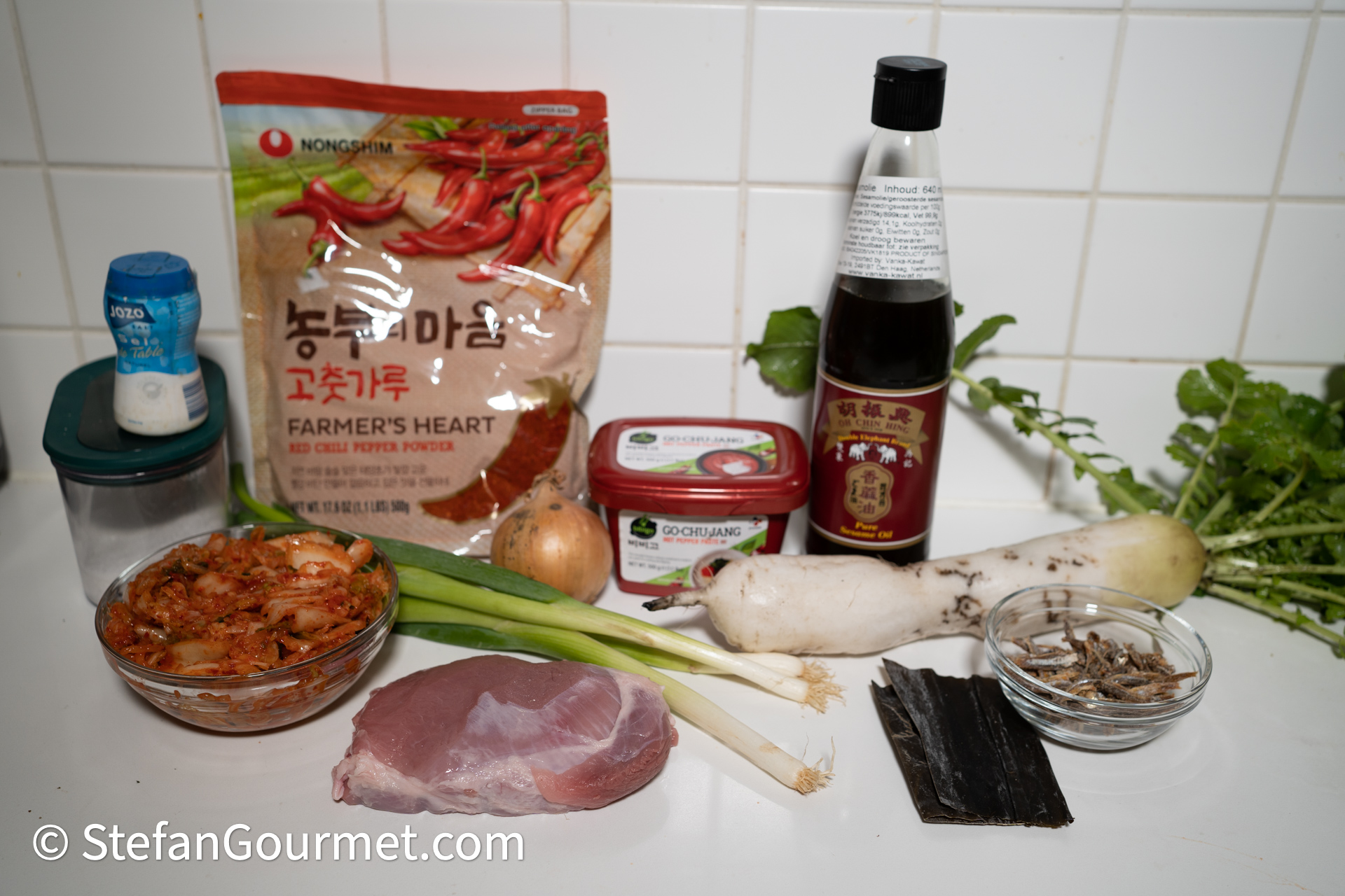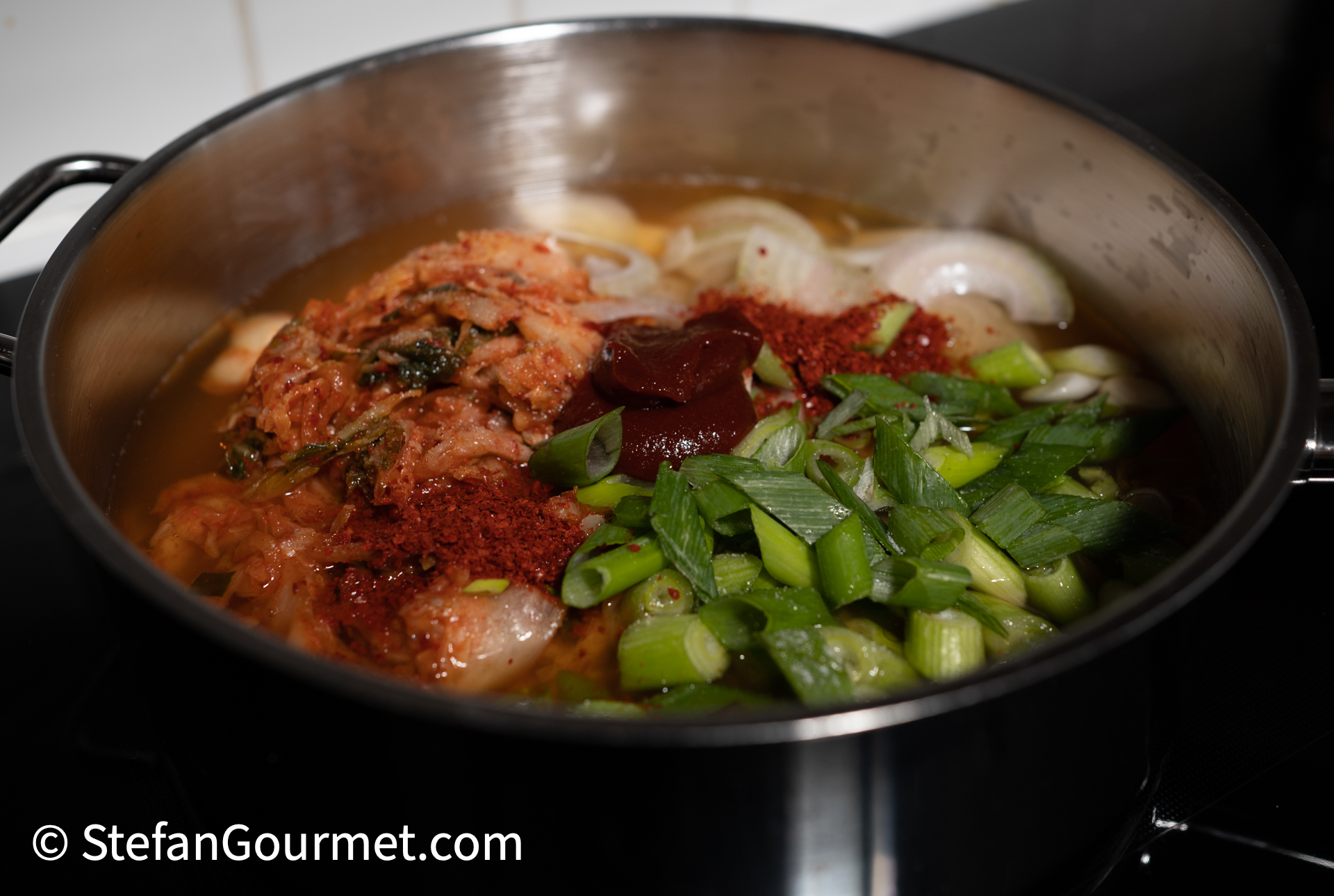 Kimchi stew has great depth of flavor because it is spicy, savory, sweet, and sour. I’ve adapted Maangchi’s recipe for sous-vide, which ensures that the pork will be tender and succulent. This is wonderful comfort food for this time of the year. For best results make your own anchovy stock from scratch, but you could substitute with pork stock. The anchovy stock is the Korean version of dashi. The kimchi should be aged for at least three weeks, and should of course also be homemade. I’ve left out the tofu, because I don’t care for it (and Maangchi lists it as “optional”).