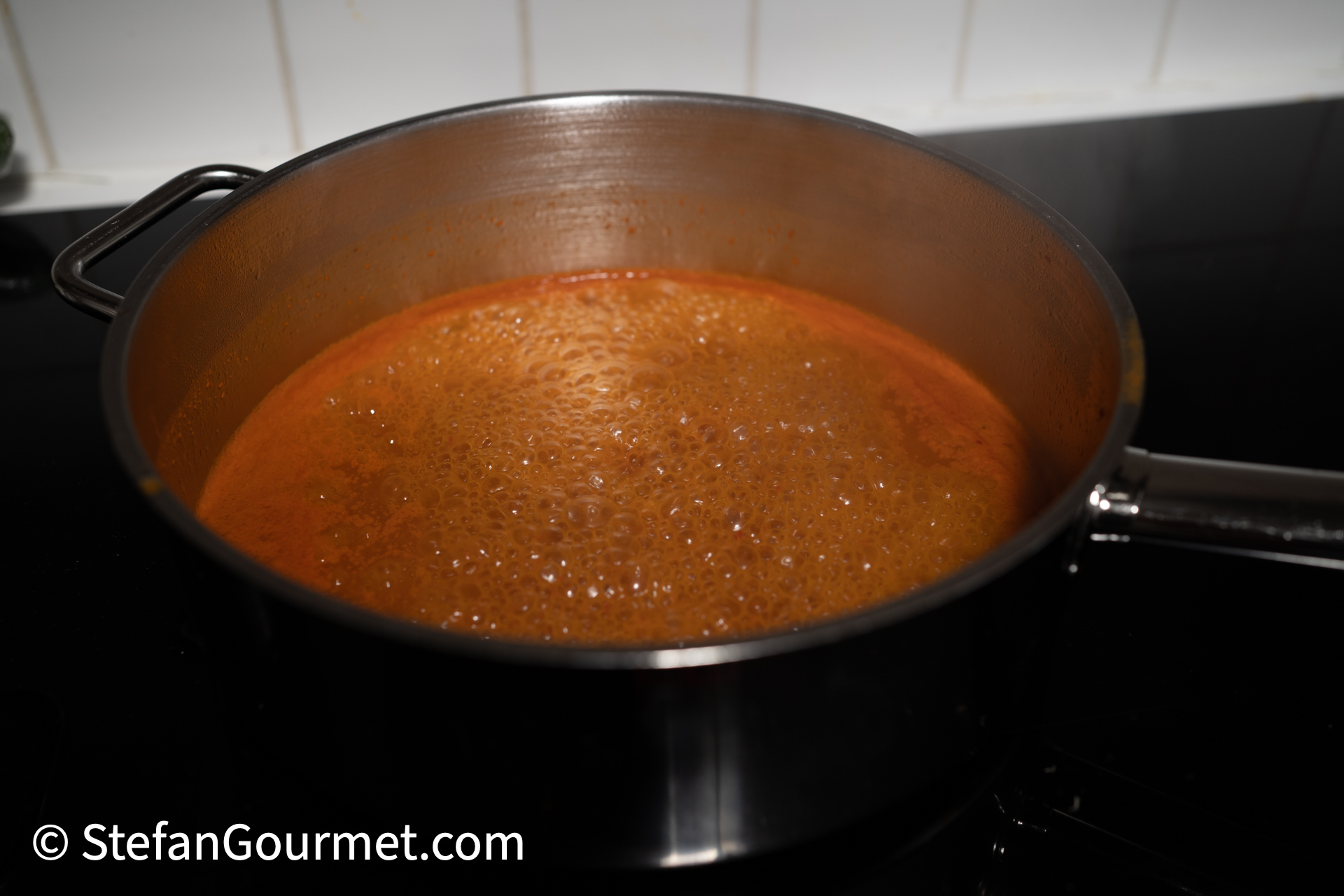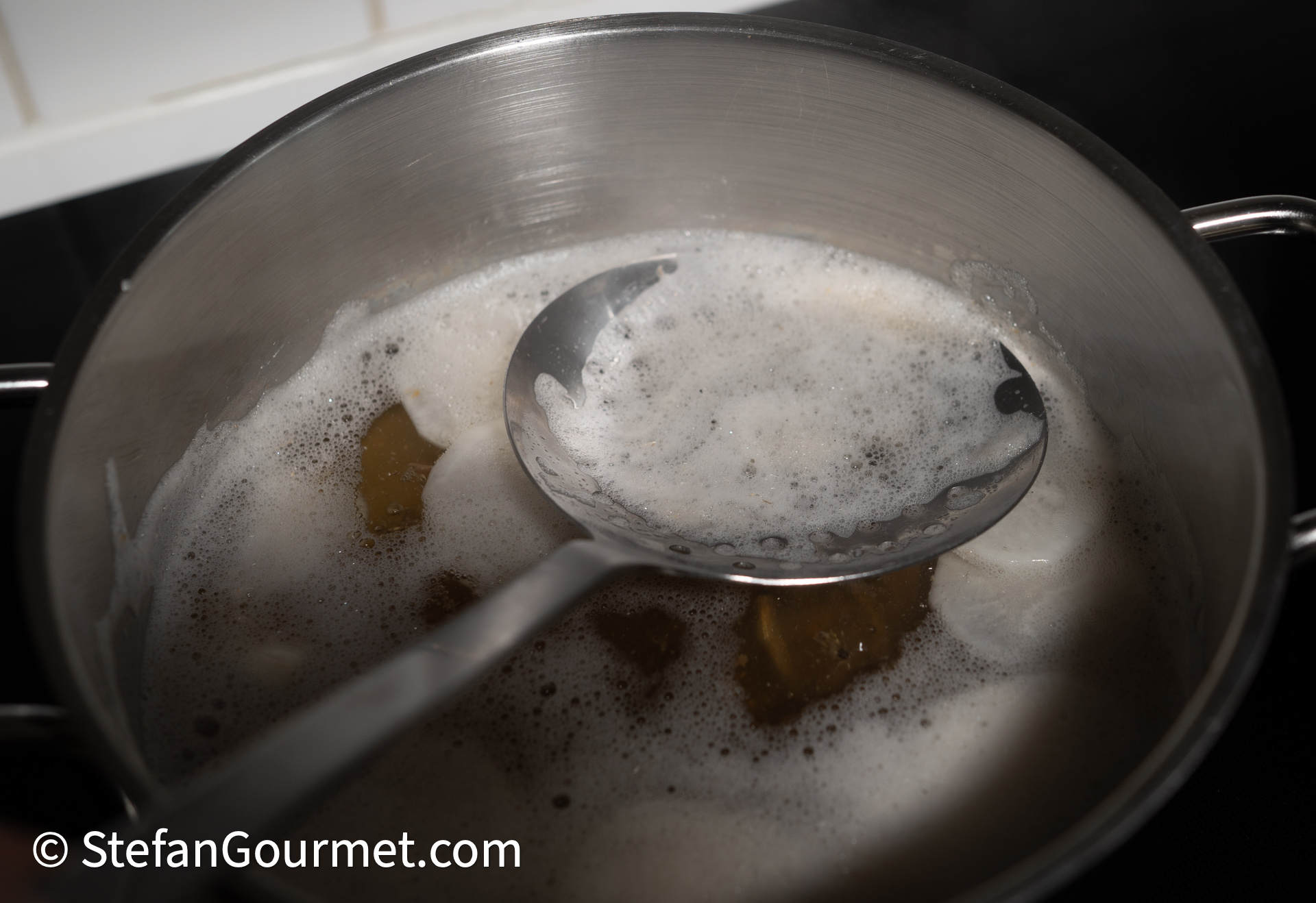 Strain the stock. You should end up with about half a litre (2 cups). If it is more, reduce it over medium heat.