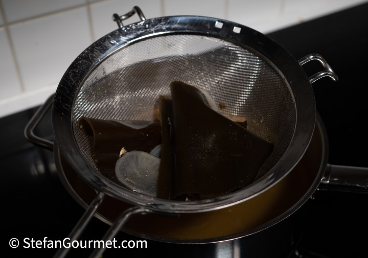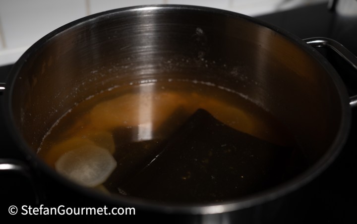 Turn off the heat and add a 10 x 12.5 cm piece of konbu. Allow the konbu to steep for 10 minutes.