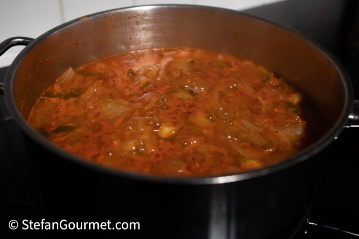 Stir and bring to a boil, and boil for 30 minutes or until the kimchi is tender but still has some bite.