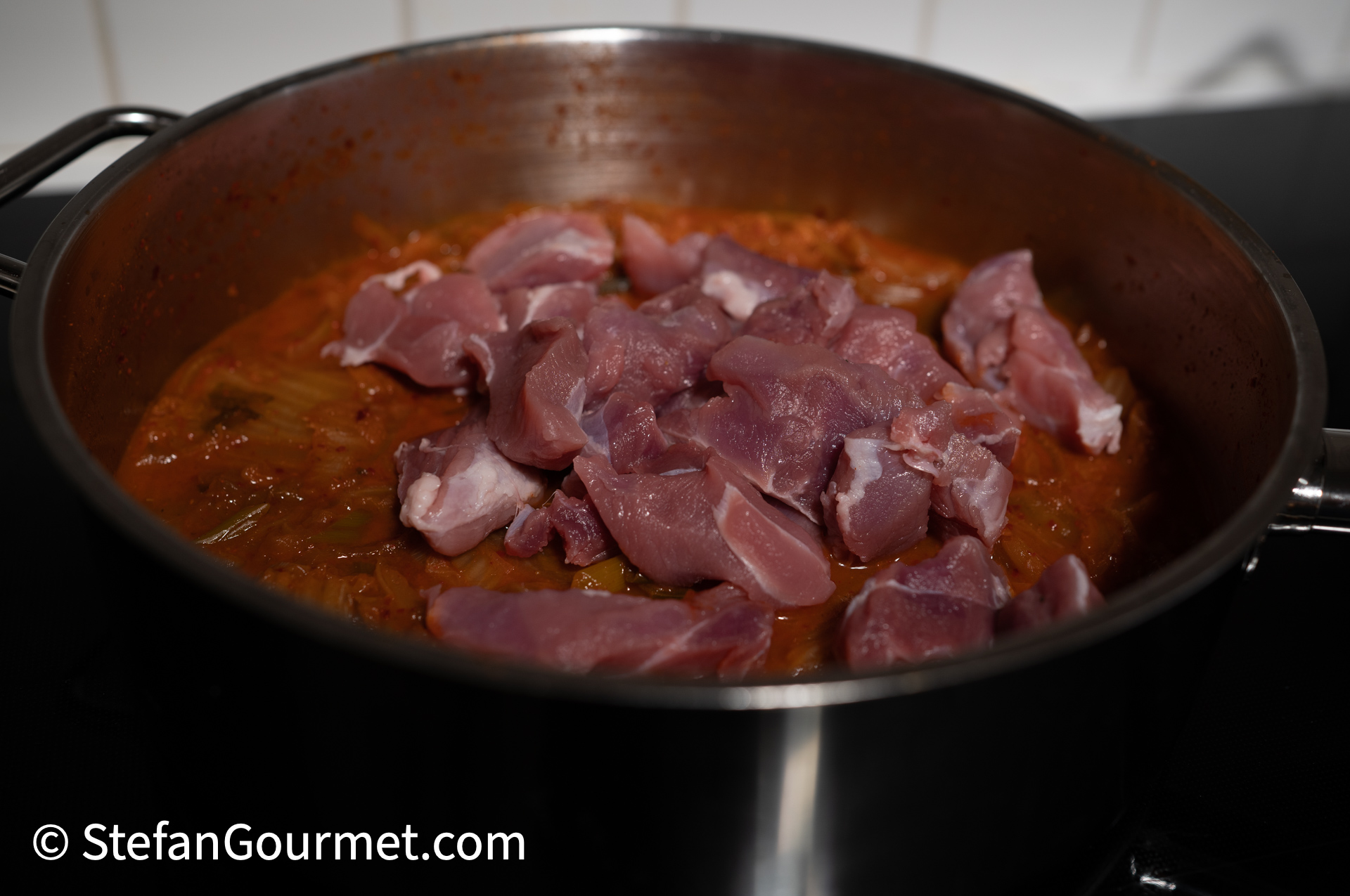 If using a ziploc bag, you can add the pork as soon as the kimchi mixture has cooled off to 57C/135F or less.