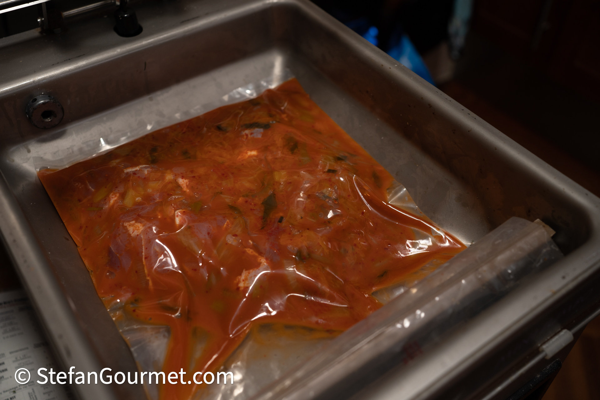 If you own a chamber vacuum machine, allow to cool to room temperature and then chill in the refrigerator before adding the pork.