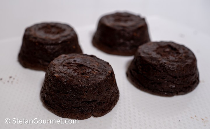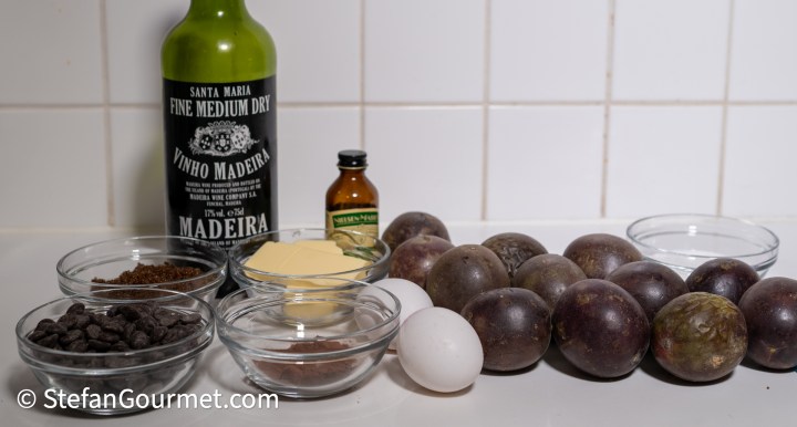 I really liked the combination of dark chocolate and passion fruit at Casa Velha in Portugal, so back home I developed a recipe based upon that idea without trying to copy the dish at Casa Velha. The end result was a flourless dark chocolate tartlet with a passion fruit topping that I made by adding sugar and cornstarch to passion fruit juice, and then heating it until thickened. Although this dessert was inspired by a restaurant in Portugal it isn’t Portuguese. But as a salute to Portugal, I did include Madeira in the chocolate cake. The result is very nice, especially when paired with a Moscatel de Setúbal (which is produced near Lisbon). This flourless chocolate cake recipe is very easy, as you can simply add all ingredients to the food processor.