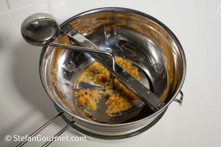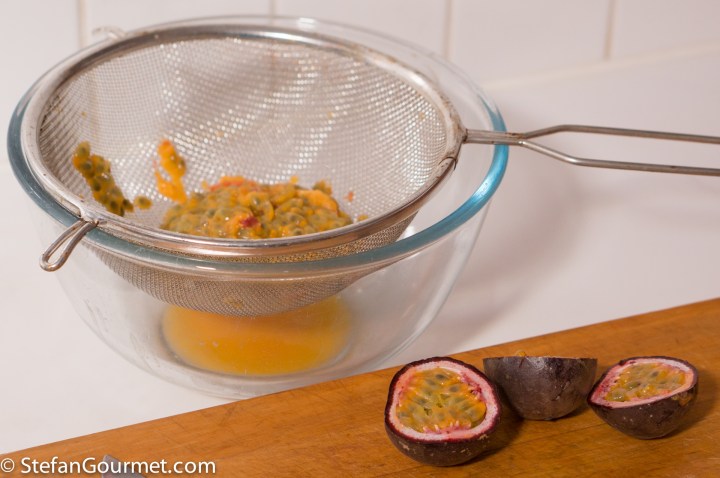 To make passion fruit juice, scoop the seeds out of 3 passion fruits and push with a spoon until all of the juice has come out. Reserve some of the seeds for garnish.