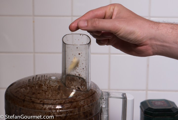 Turn on the food processor and with the motor running, add the hot Madeira. It will melt the chocolate.