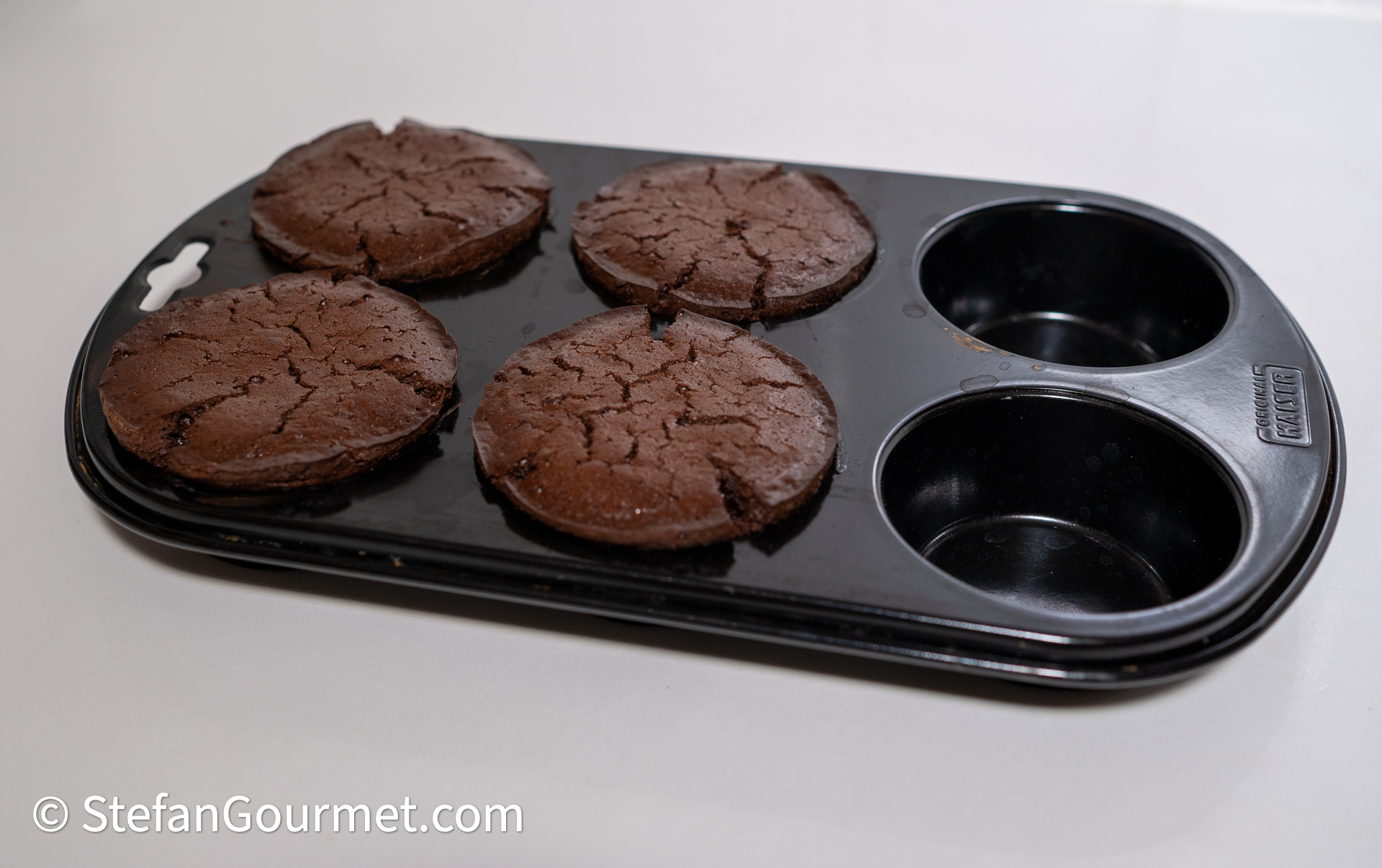 Allow the chocolate tartlets to cool to room temperature before turning over the pan to let them fall out. Peel away the parchment paper.