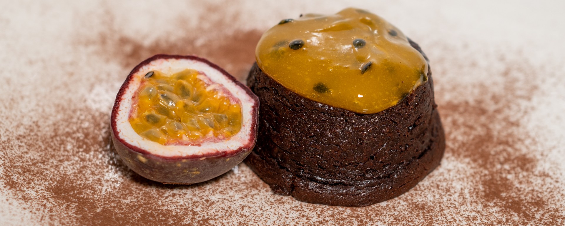 Halve the remaining passion fruit, and serve the chocolate tartlet with the passion fruit.