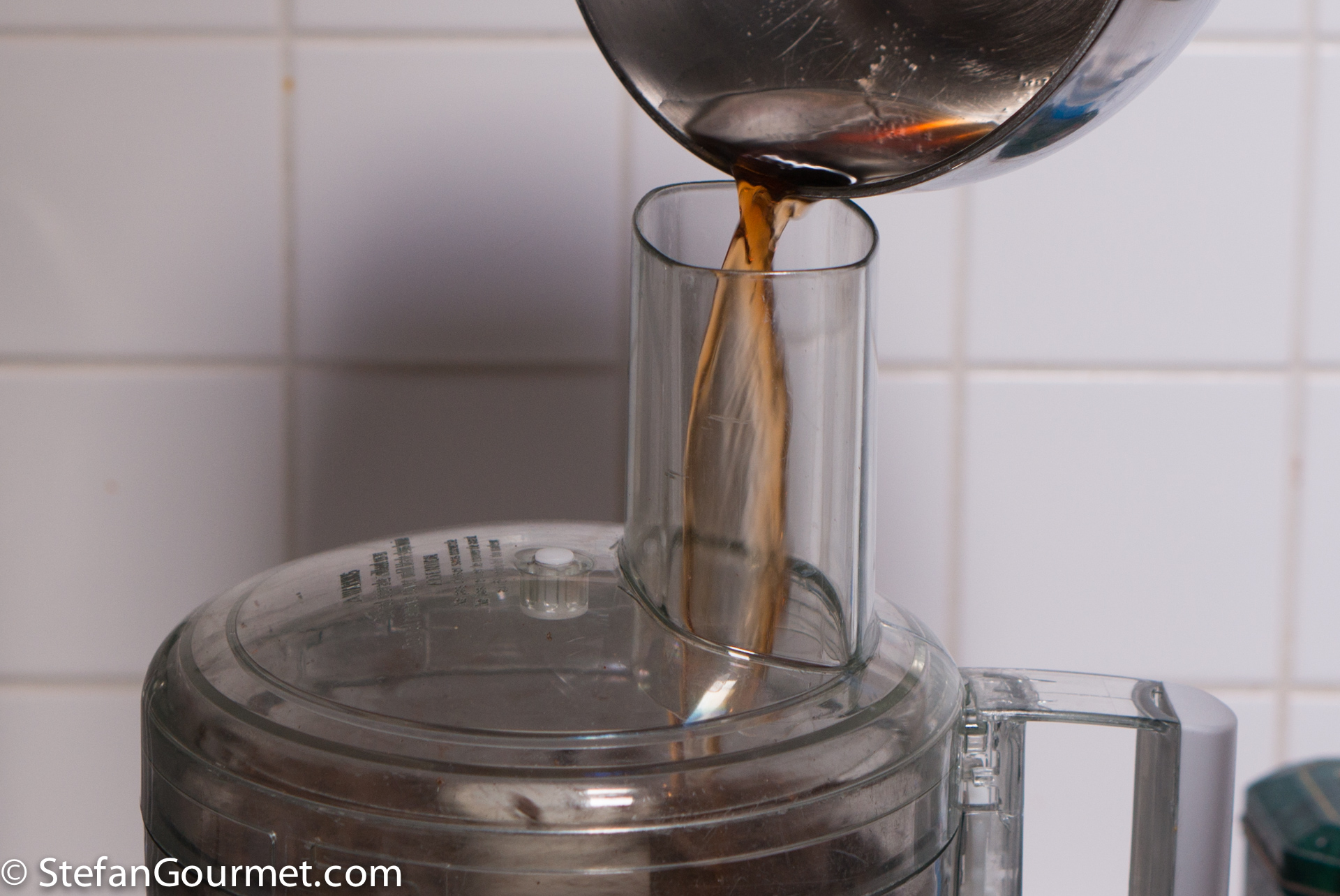 Turn on the food processor and with the motor running, add the hot Madeira. It will melt the chocolate.