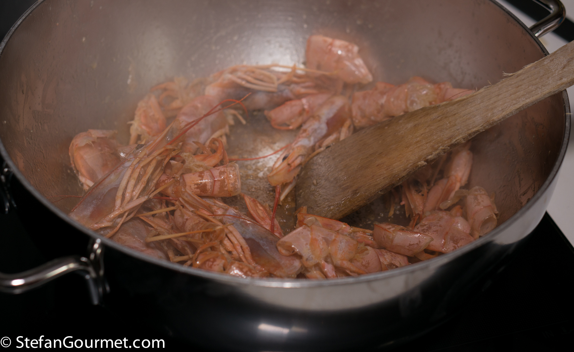 Peel the shrimp. Heat 2 tablespoons of olive oil. Add the shrimp heads and shells, and sauté until they have a nice pink color.