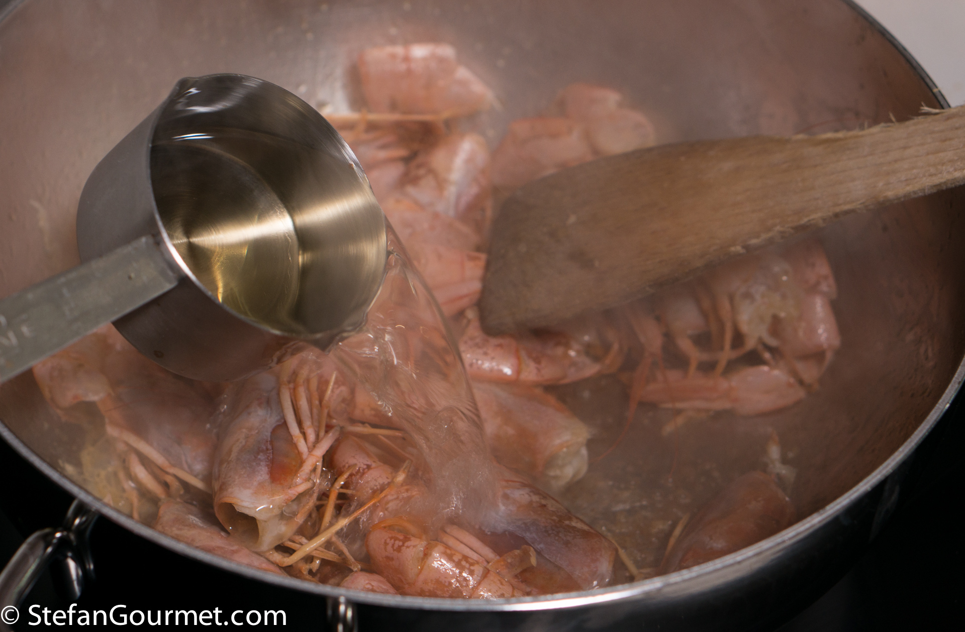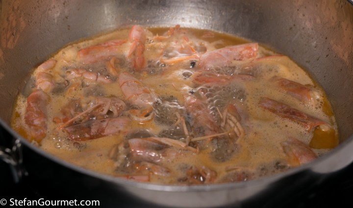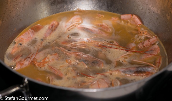 When the wine has been reduced by half, add cold water to barely cover the heads and shells. Bring to a boil…
