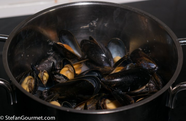 While the shrimp stock is simmering, put the mussels in a pot with 125 ml (1/2 cup) of water. Cover and cook over high heat until the mussels have opened. Sieve the liquid. A sieve lined with kitchen paper is best to get rid of any sand.