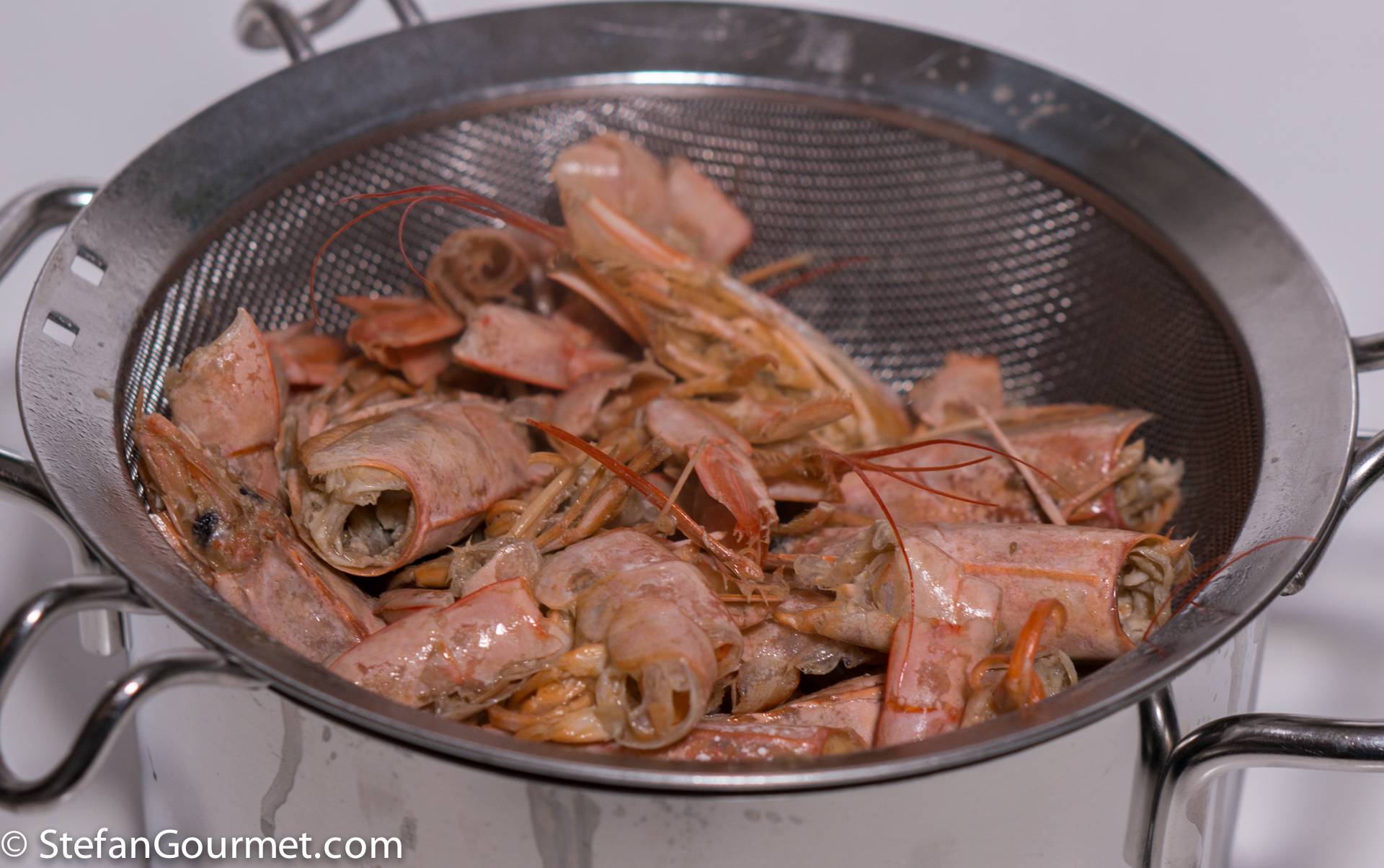 Sieve the shrimp stock, pressing down on the heads to get as much flavor out as possible.
