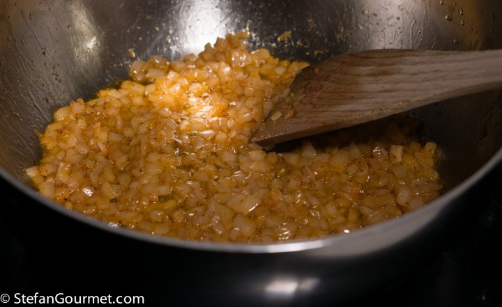 Heat the remaining 2 tablespoons of olive oil in a casserole or Dutch oven. Add a minced onion and stir over medium heat until the onion is golden.