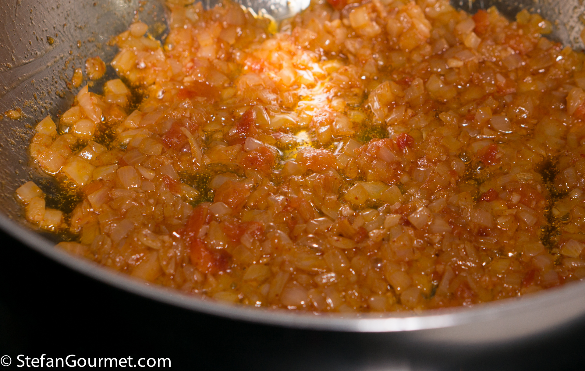 …and stir until the tomato has fallen apart. Season lightly with chilli flakes. This should only add depth of flavor, it should not become spicy.