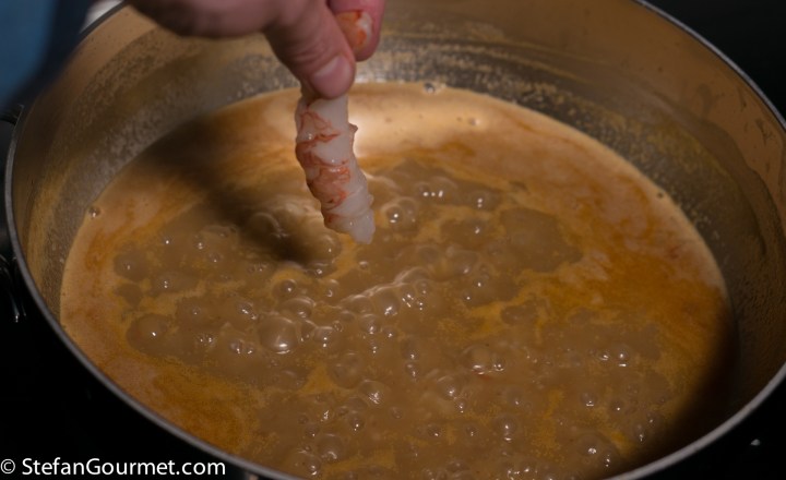 The delicious flavor comes mostly from the liquor that is released by the clams and mussels, and from the heads and shells of the shrimp. I couldn’t find any crab claws, so left them out. As with all recipes of this type, there are no fixed ingredients and you use what you have at hand. I used pink Argentinian shrimp, which are pink even when they’re raw.
