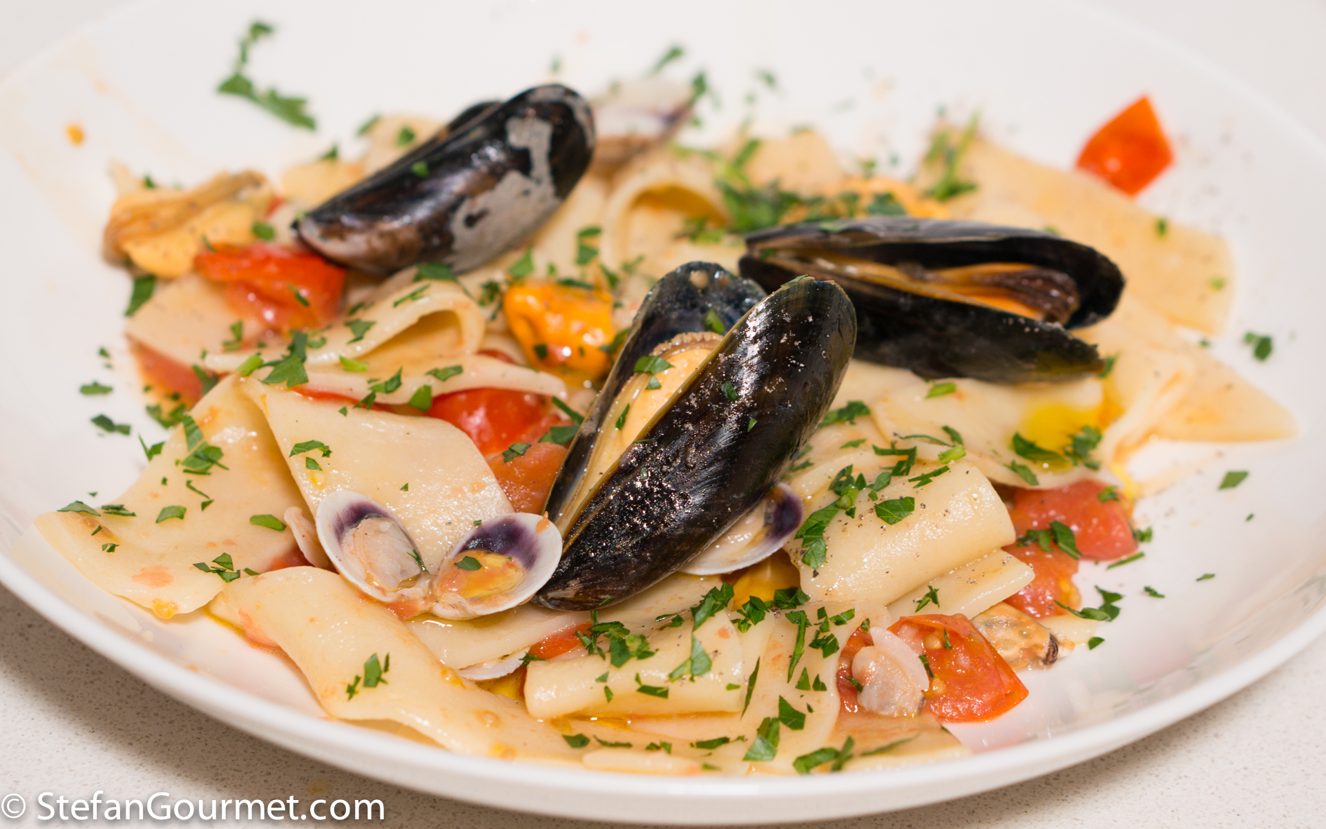 Today’s flash back is another vacation memory, but this one of our trip to the Amalfi Coast two years ago: Scialatielli ai frutti di mare. Scialatielli is fresh pasta made from semolina flour and water, and shaped as long rectangles, and typical to this part of Campania.