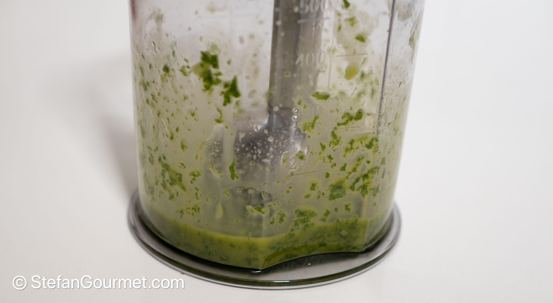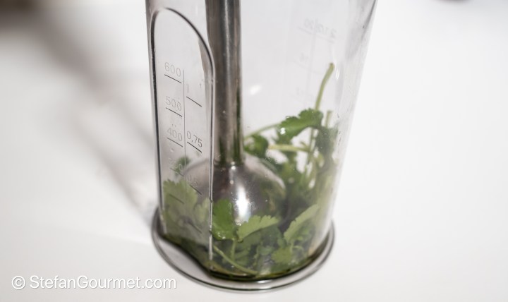 Put some fresh parsley or cilantro in the container of a blender together with a tablespoon of extra virgin olive oil.