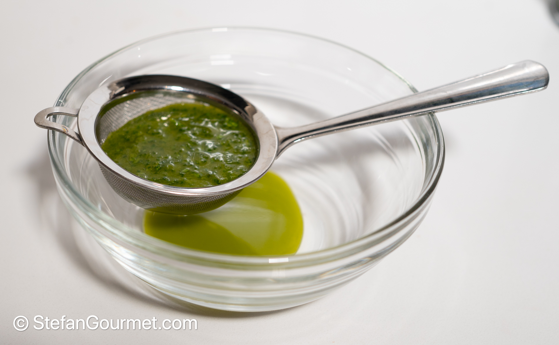 Strain the mixture through a fine sieve, pressing down with a spoon to obtain a green oil.