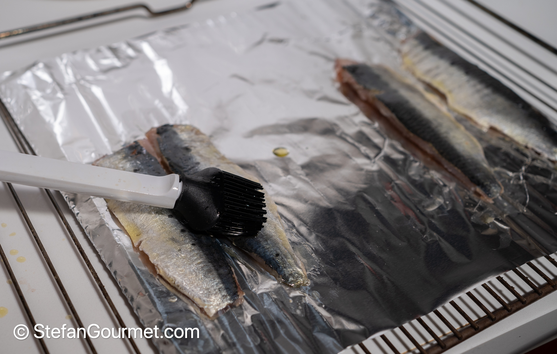 Preheat the broiler in your oven, or (even better) build a charcoal fire. Brush both sides of the sardines with olive oil.