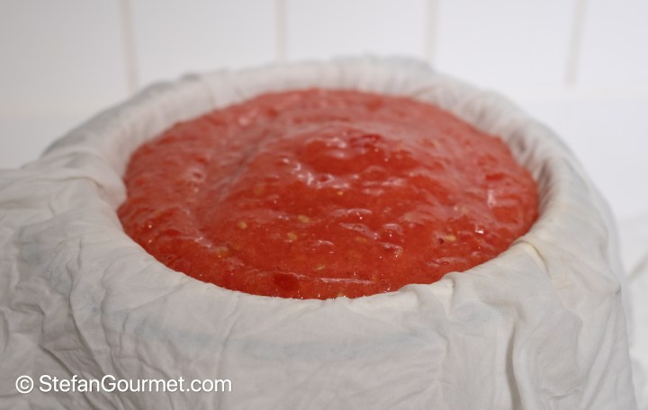 Put the pureed tomatoes in a muslin or other fine cloth (an old but clean tea towel would also be fine).
