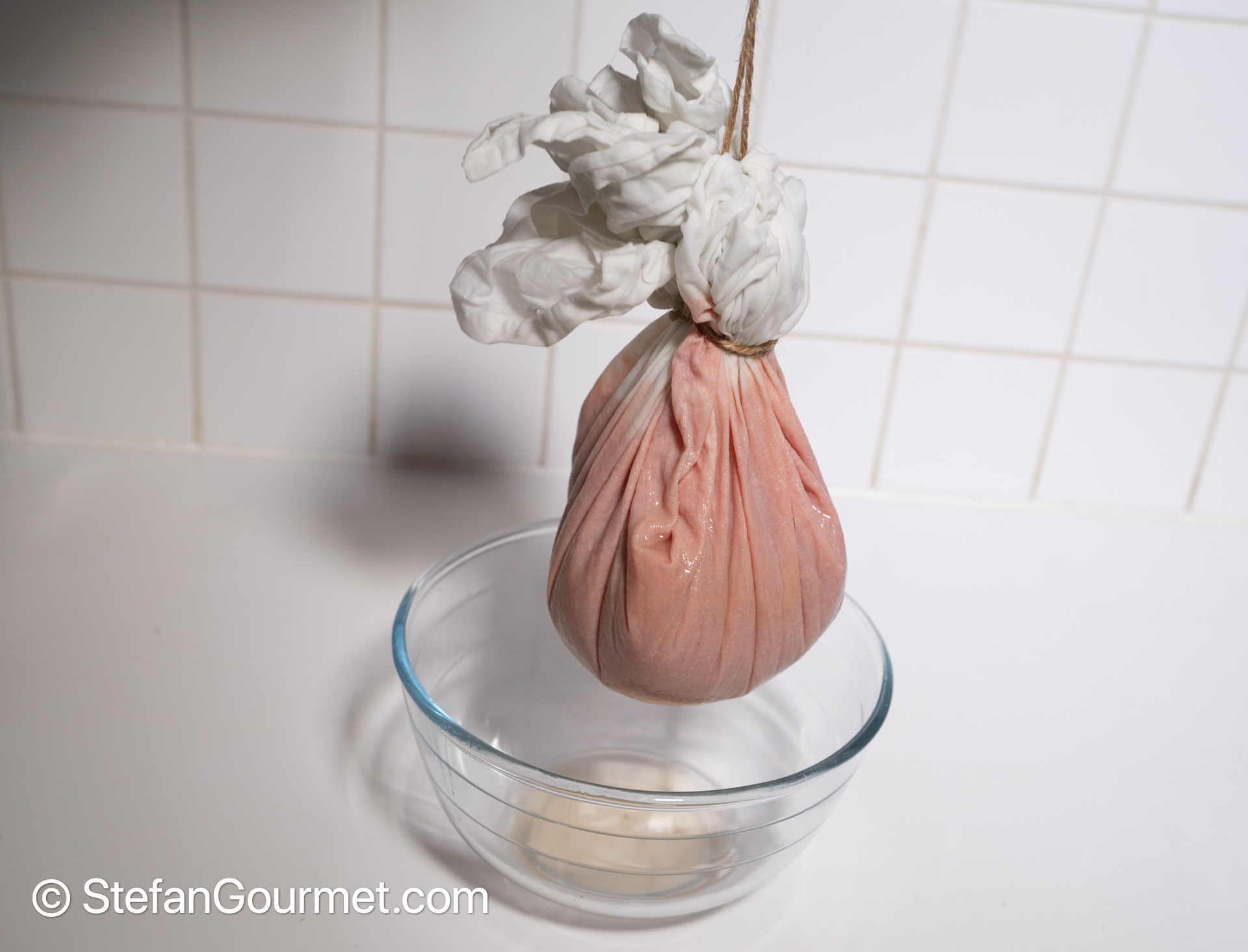Hang up the cloth with a bowl underneath to catch the tomato water. Put it in the refrigerator overnight.