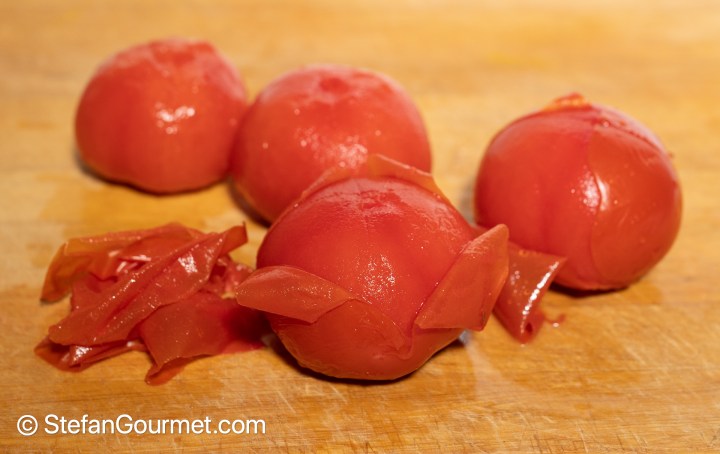You can now easily peel the tomatoes. Do that, and discard the skins.