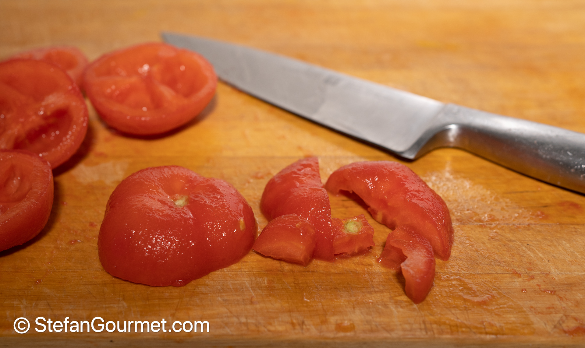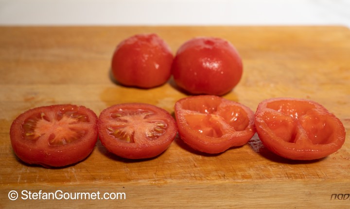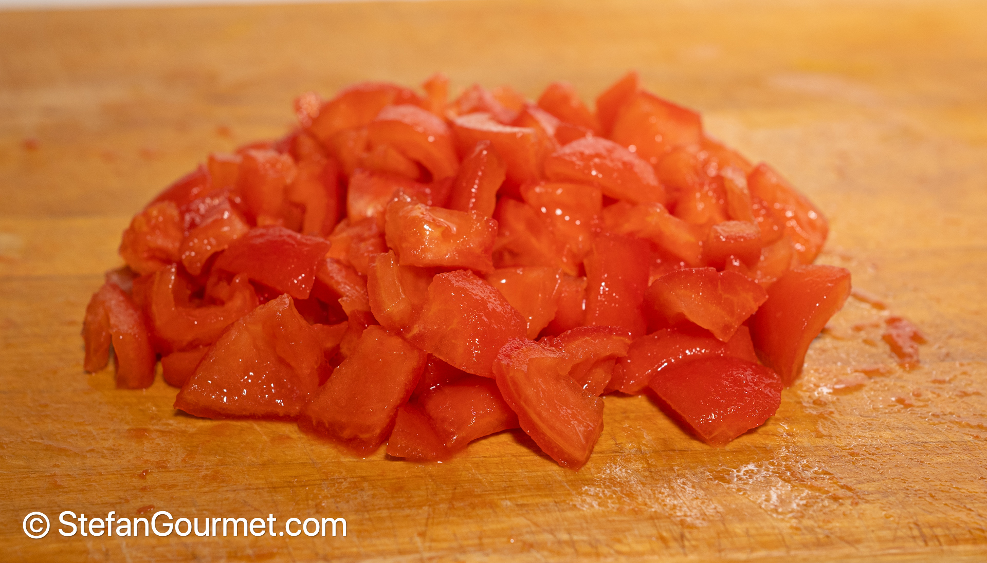 Cut the tomatoes in half crosswise, and remove the seeds with your fingers or a small spoon. Discard the seeds. (You could also use the seeds for the tomato water, but I would recommend to prepare the concassé briefly before serving the dish rather than the day before).