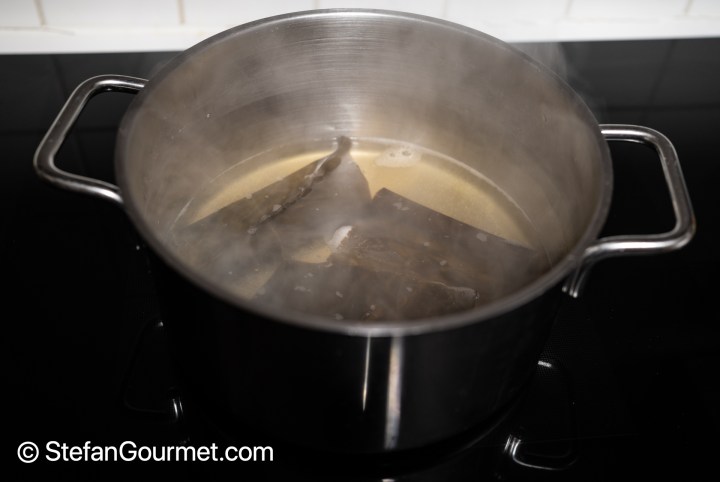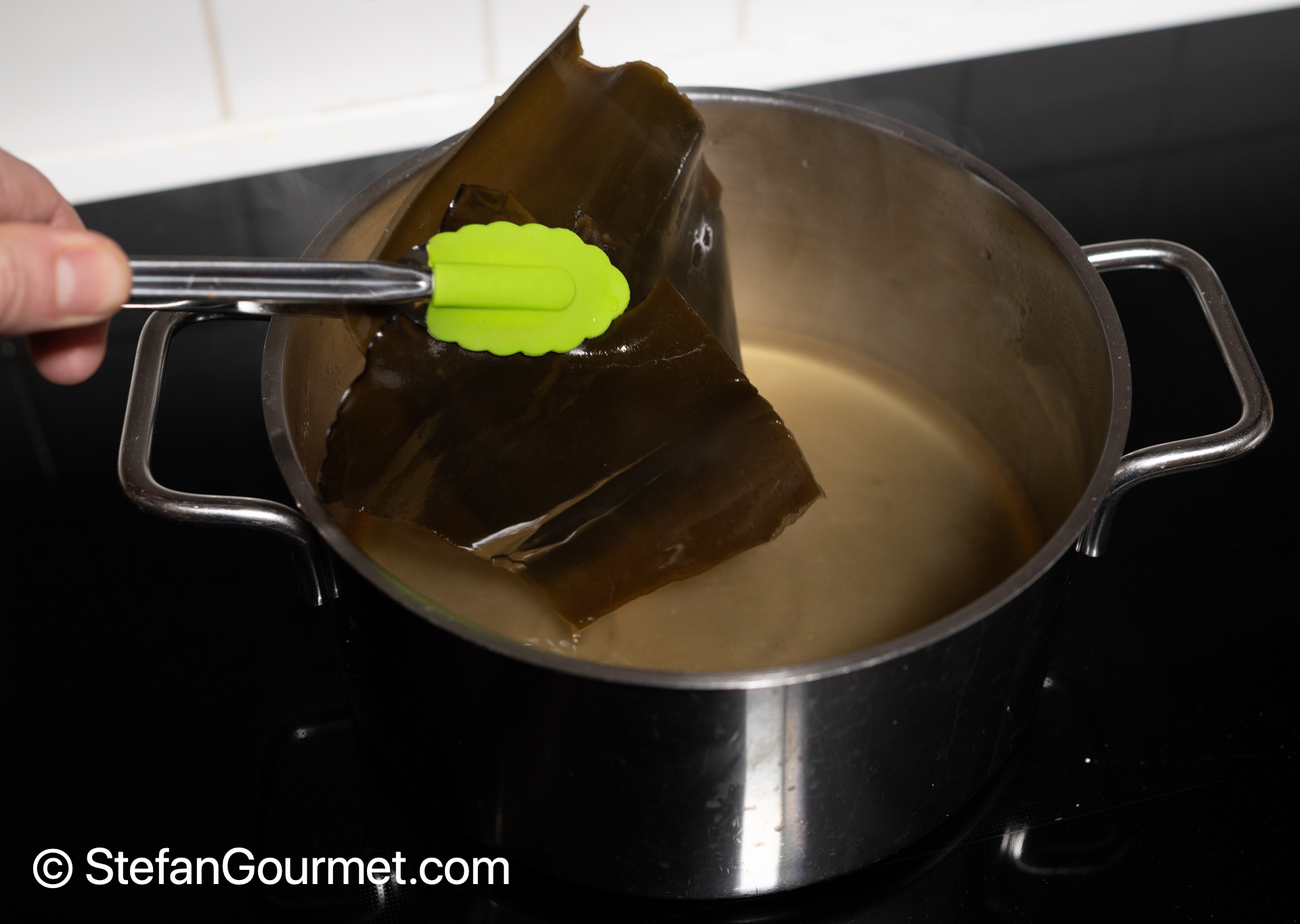 Put the tomato water in a saucepan and add 10 grams of konbu. Bring this almost, but not quite, to a boil, then turn off the heat just before it starts to boil, and allow to steep for 10 minutes.