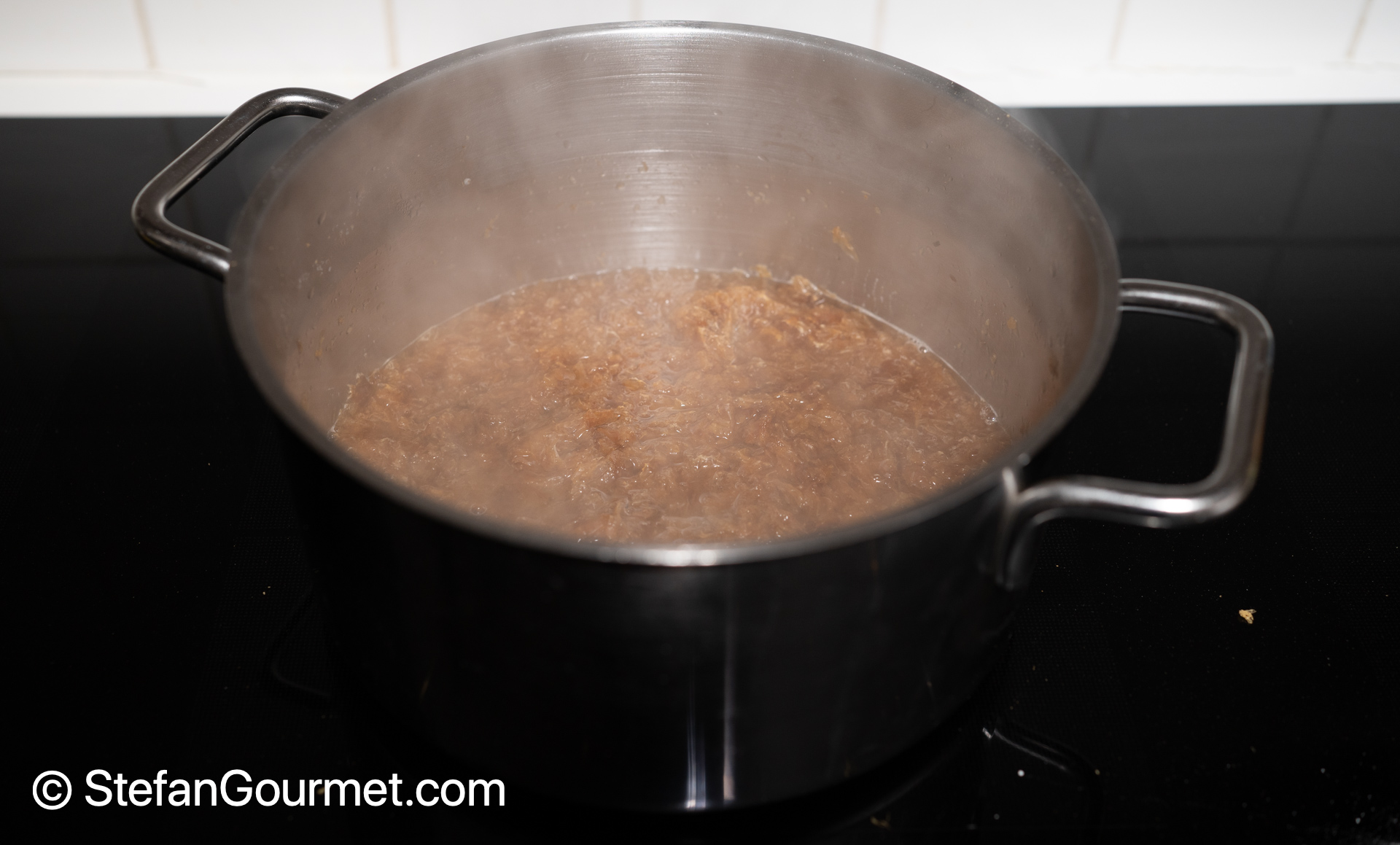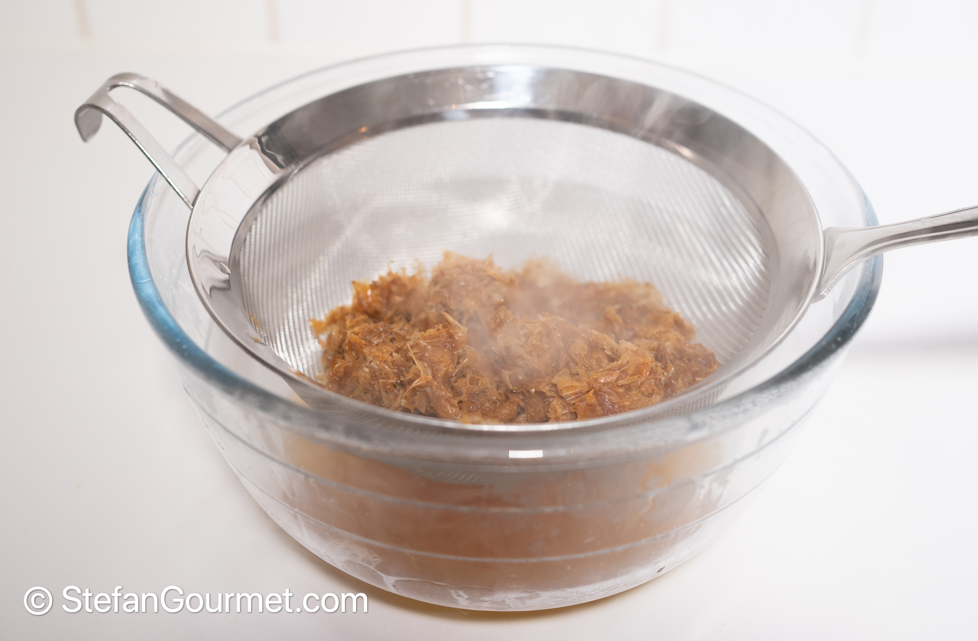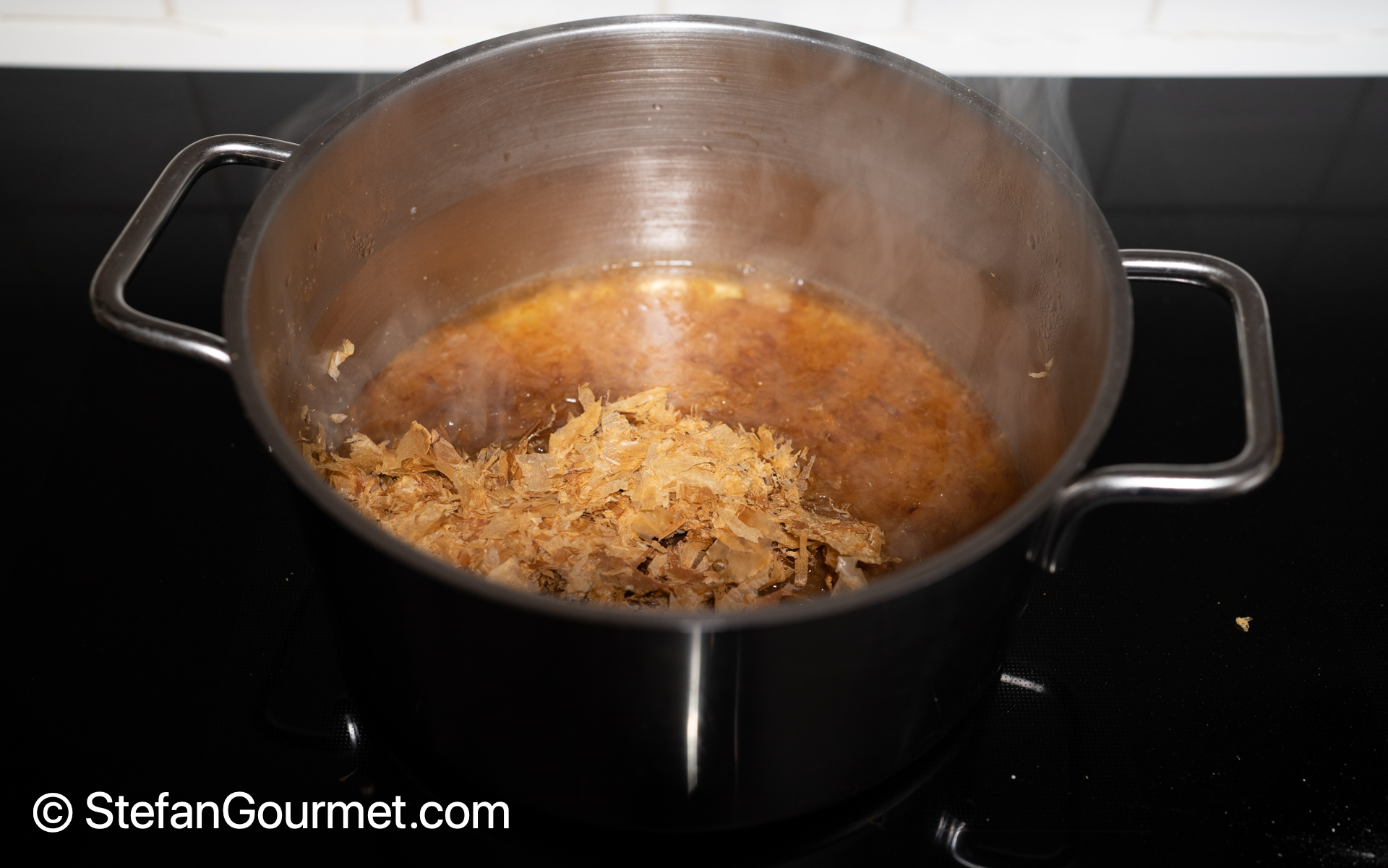 Bring the liquid almost to the boil again. When it is almost boiling, turn off the heat, and add 20 grams of katsuobushi.
