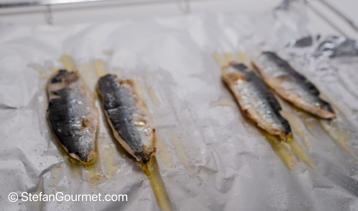 Broil or grill the sardines on one side only with the skin side towards the heat source, just until the skin shows some brown spots. This will only take a few minutes; do not overcook the sardines.