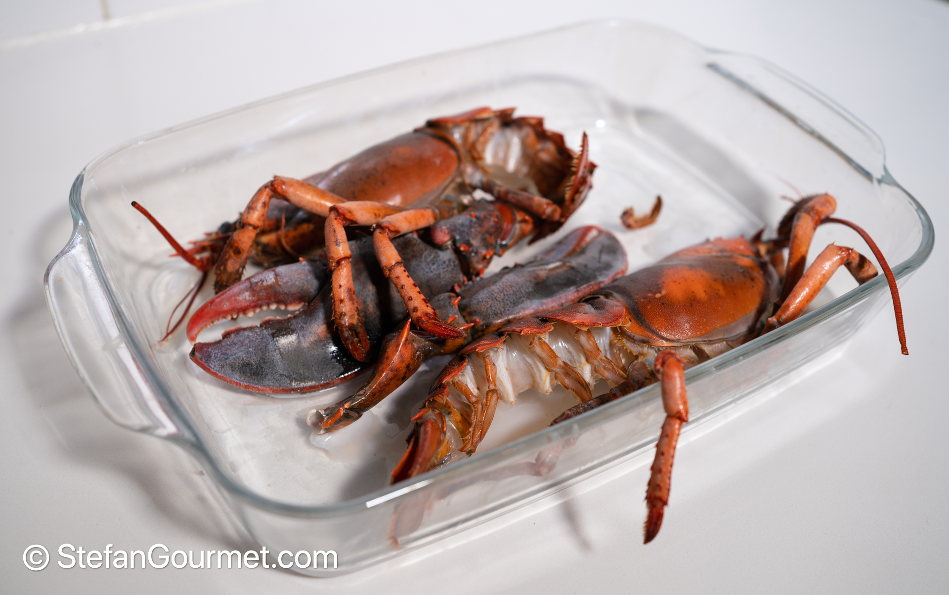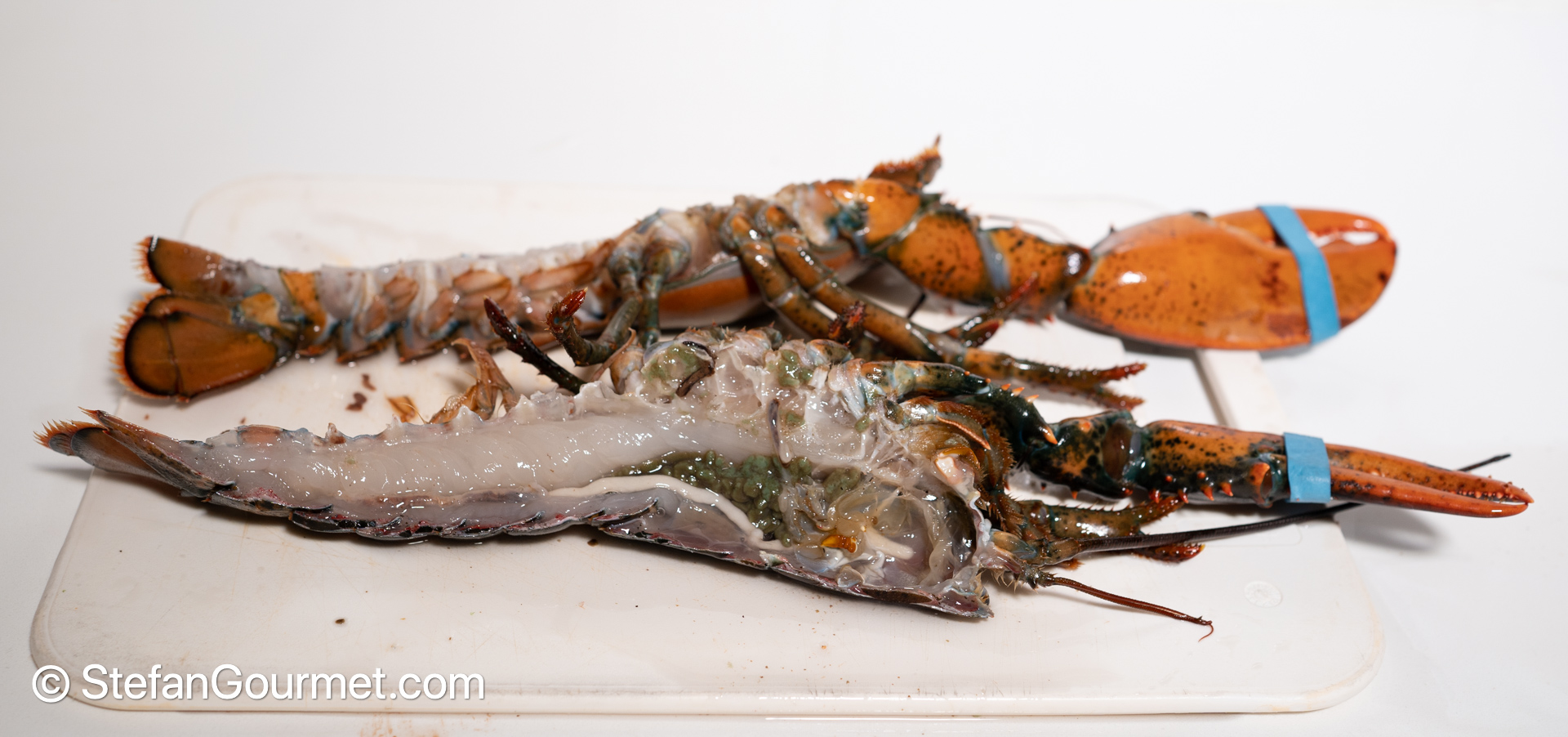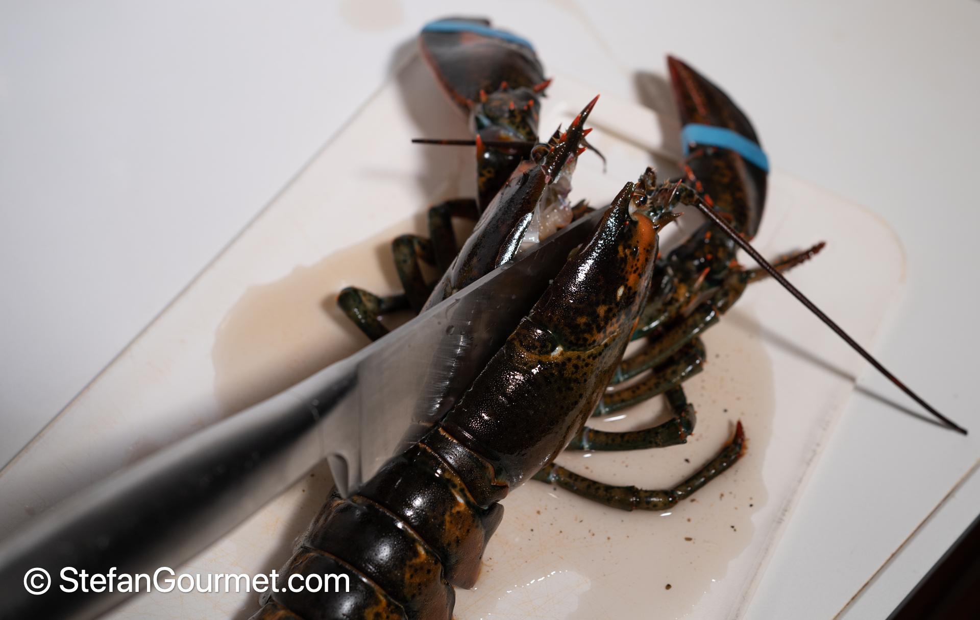 Cut the lobster in half lengthwise. If you do this with a live lobster, start with the head so you will kill it instantly.