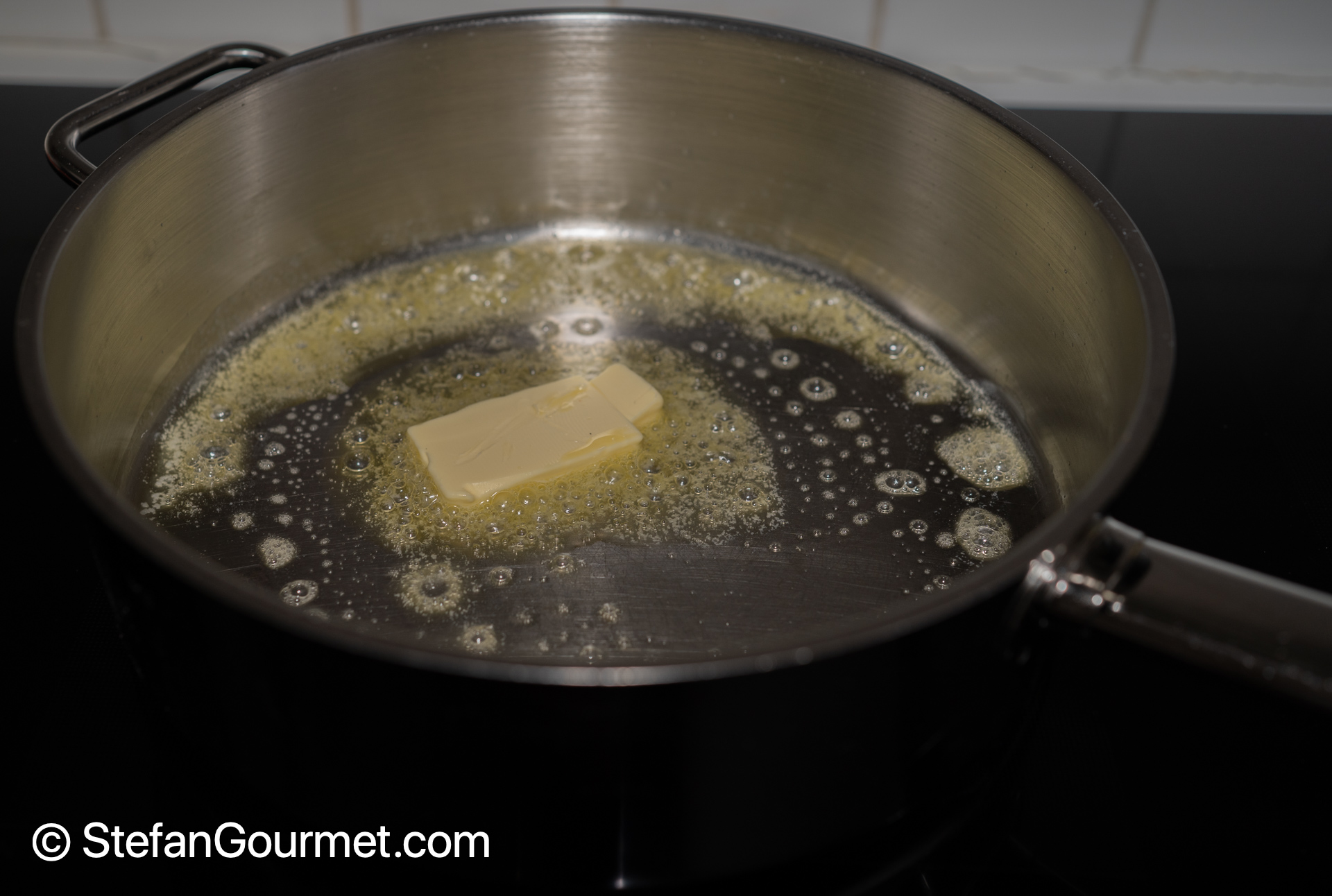 Add the reserved lobster drippings from the oven dish to the sauce.