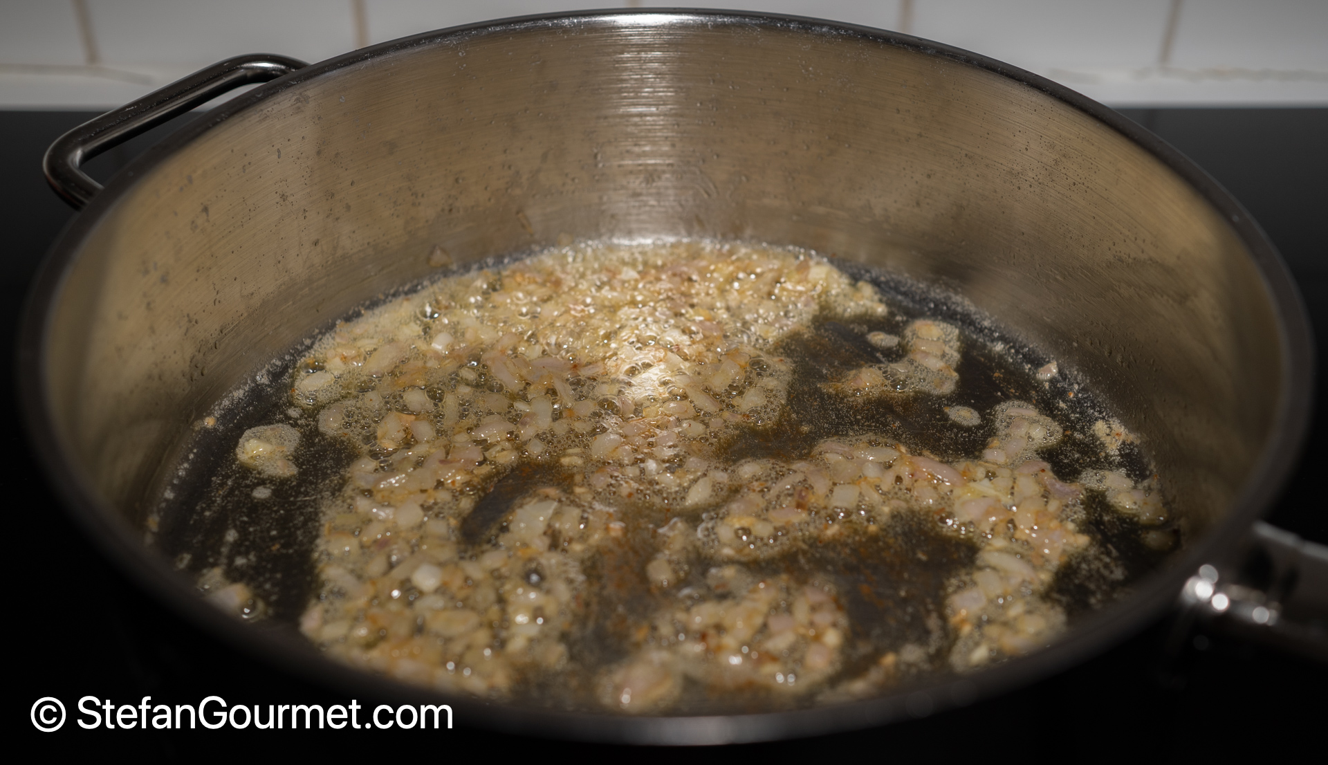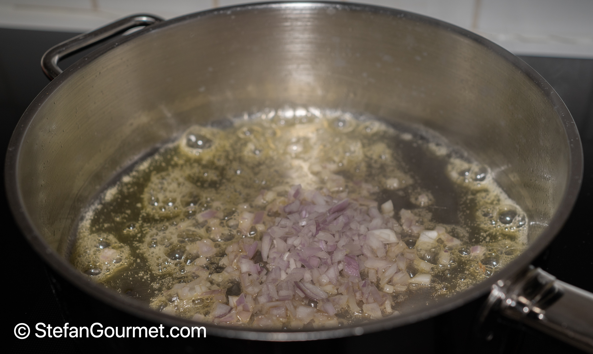 Increase the heat to medium-high and deglaze the shallots with 30 ml of cognac.